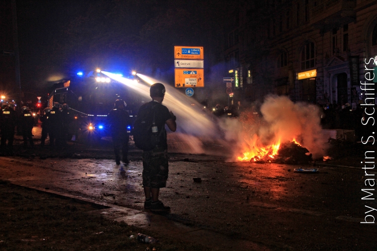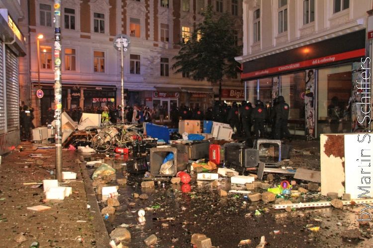 Neben einigen Zusammenstößen im Hafenviertel kam es auch in der Schanze zu schweren Auseinandersetzungen, die in der Nacht zu kriegsähnlichen Zuständen führten.